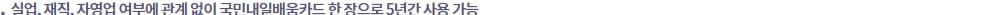 - 실업, 재직, 자영업 여부에 관계없이 국민내일배움카드 한장으로 5년간 사용이 가능하다고 합니다.