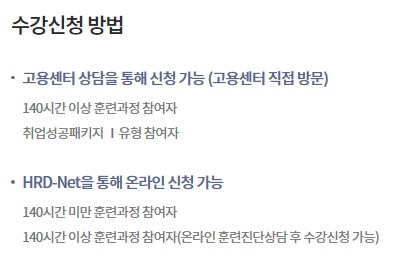 훈련과정 수강신청은 140시간 이상 훈련과정은 고용센터 상담을 통해 신청이 가능하고 140시간 미만의 훈련과정은 HRD-NET을 통해서 신청이 가능합니다.