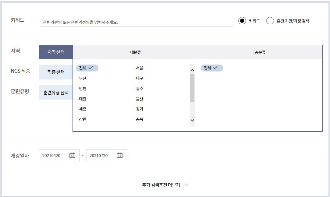 내일배움카드의 훈련을 찾기가 가능한데요~! 지역별로, 직종별로, 훈련유형별로 선택을 할 수 있습니다. 물론 지역도 중요하겠지만 자신이 배우고자 하는게 어떤 직종인지 내가 흥미가 있는지가 중요할 것 같네요. 만약 지역중에 아무거나 선택한다면 흥미가 없거나 못하거나 해서 중간에 못할수도 있으니깐요.
