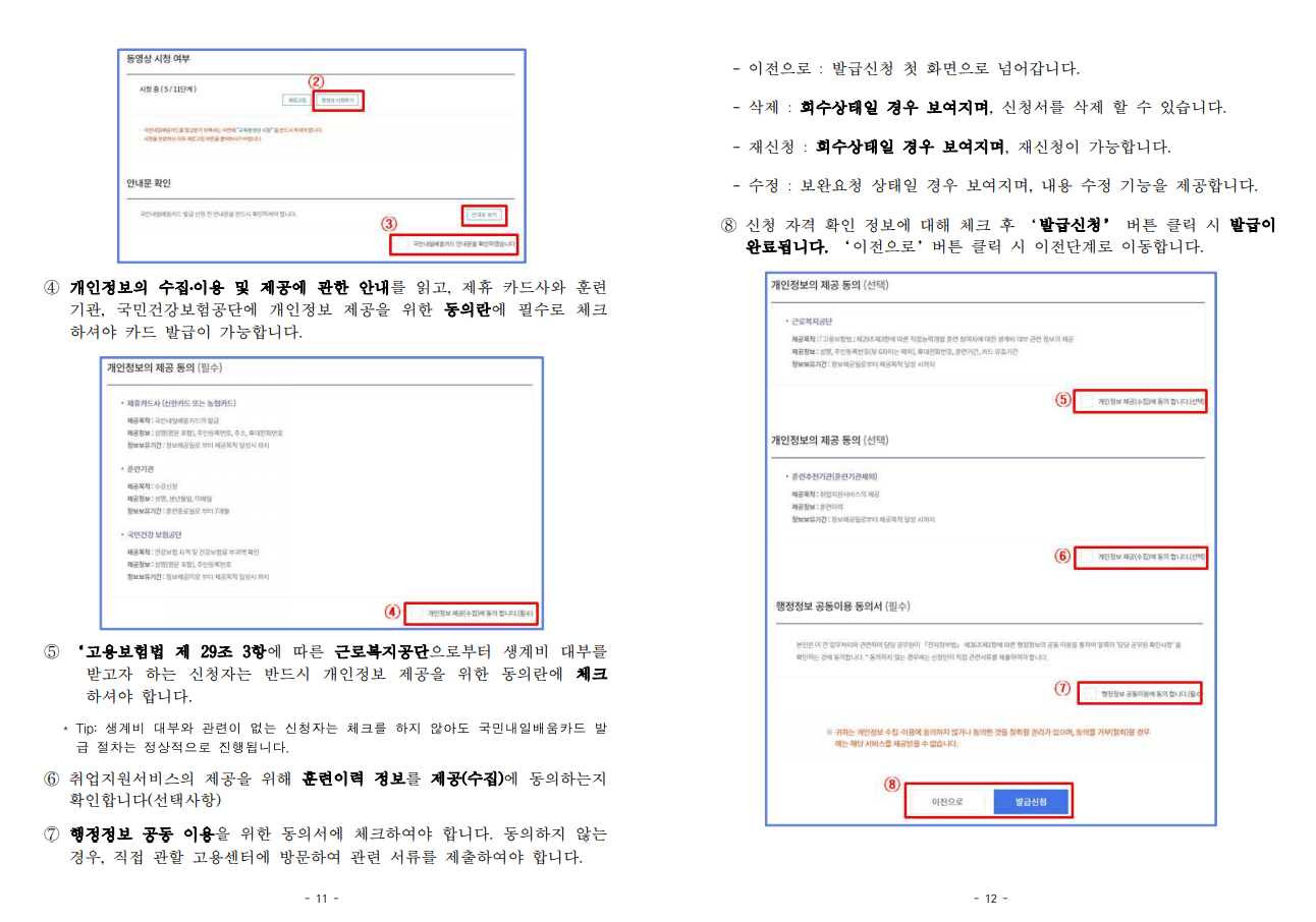 이것은 홈페이지에서 국민내일배움카드를 발급신청하는 메뉴얼입니다. 이것을 보시고 내일배움카드를 발급신청하시면 될 것 같아요. 제가 하나씩 하면서 설명을 드리고 싶은데 저는 신청대상자가 아니기 때문에 직접 해보지는 못했습니다. 나라에서 이런 좋은 사업을 하면 홍보도 하면 참 좋을텐데 아는 사람만 알고 모르는 사람은 모르는 내일배움카드 입니다. 국민내일배움카드 발급신청자격이 되시면 꼭 신청하셔서 자신의 직종에 맞는 그런 교육훈련을 받으시길 바랍니다. 요즘 워낙 시대가 빨리 변해서 따라가지못하면 도태됩니다.. 그만큼 뒤쳐지는 것이고 노력을 해야 살아 남을 수 있습니다. 모두 어려운 시대에 화이팅입니다. 이상으로 내일배움카드 발급신청 방법 및 자격요건에 대해 알아보았습니다.