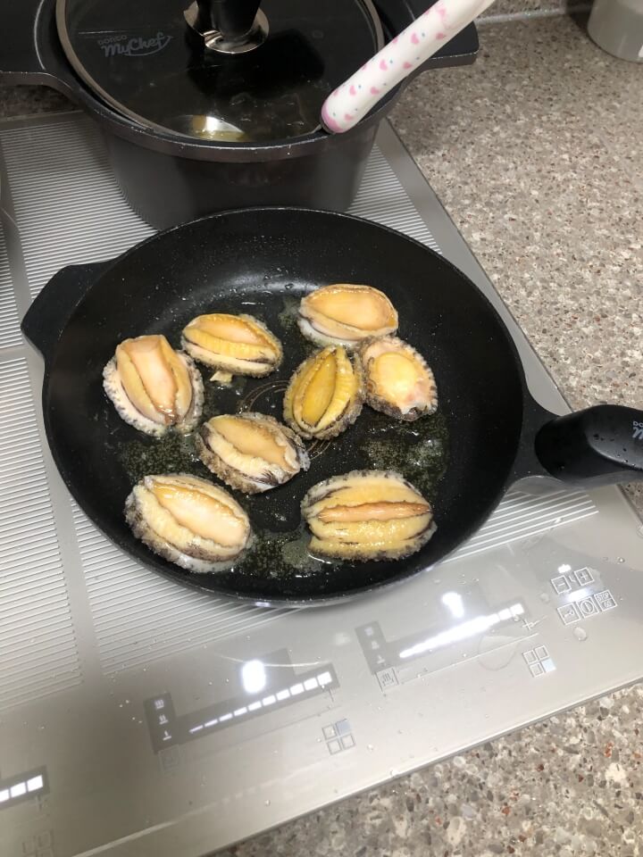 후라이팬에 버터를 둘러 주시면 됩니다..! 앗.. 저기 전복 한마리가 보이네요.. 적당량 후라이팬에 버터를 누른 후 녹여주시면되요~! 마트에 파는 버터도 괜찮고 그.. 일회용 버터 있잖아요?? 그걸로 하셔도 되요~! 둘러서 적당히 퍼졌을때 전복을 투입해 줍니다.