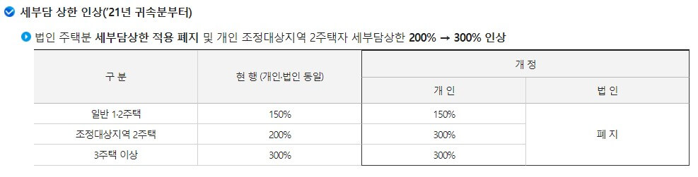 법인 주택분 세부담상한 적용 폐지 및 개인조정대상지역 2주택자 세부담상환이 200% >> 300%로 인상 되었습니다.