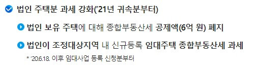 - 법인이 2020년6월18일 이후 8년 장기 임대등록하는 주택도 추가세율 적용(임대기간 8년이상, 주택가액 수도권 6억원 비수도권 3억이하)
