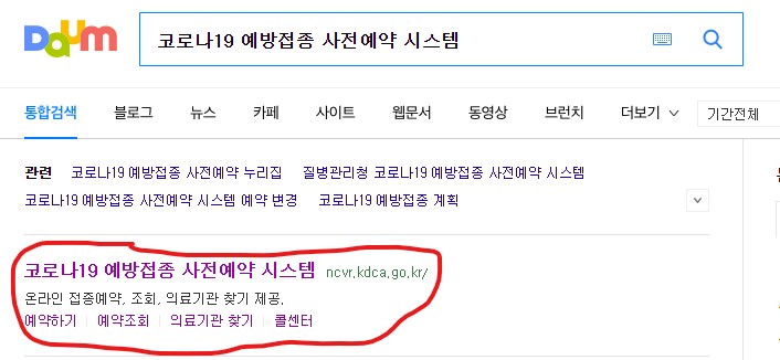다음에서 코로나19 예방접종 사전예약 시스템이라고 검색하시면 요렇게 홈페이지가 나옵니다. 여기 홈페이지에 접속하시면 코로나 예약, 예약조회, 예방접종을 해주는 병원, 콜센터 등등 여러가지 정보가 많이 있으니 여기서 확인해시면 됩니다.