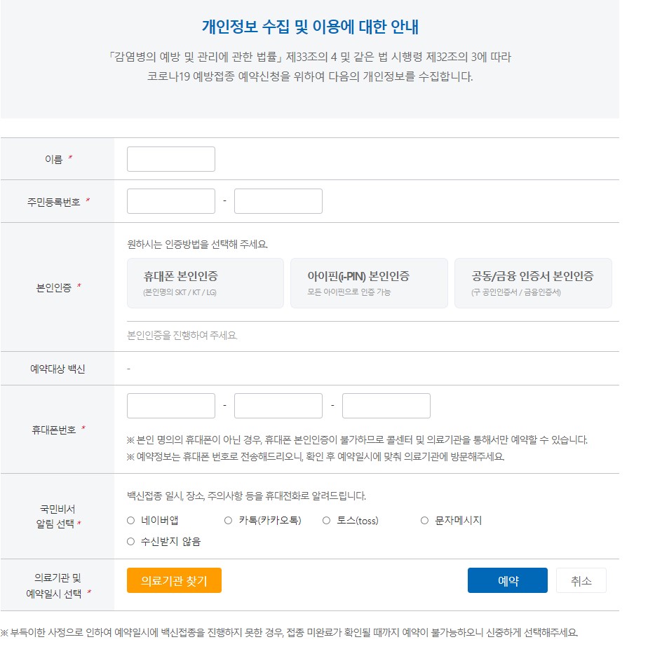 코로나19 예방접종 사전예약시스템에서 본인 예약 및 대리 예약에 들어가시면 요렇게 개인정보를 입력하는 곳이 나옵니다. 간단하게 이름, 주민등록번호를 입력한 후 본인인증을 하시고(휴대폰, 아이핀, 공동인증서) 휴대폰 번호를 입력하시면 됩니다. 의료기간은 본인인증을 확인 후 찾기가 가능하다고 합니다. 이렇게 코로나19 예방접종 사전예약시스템을 활용하시면 간단하게 코로나19 백신 예방접종을 할 수 있습니다.