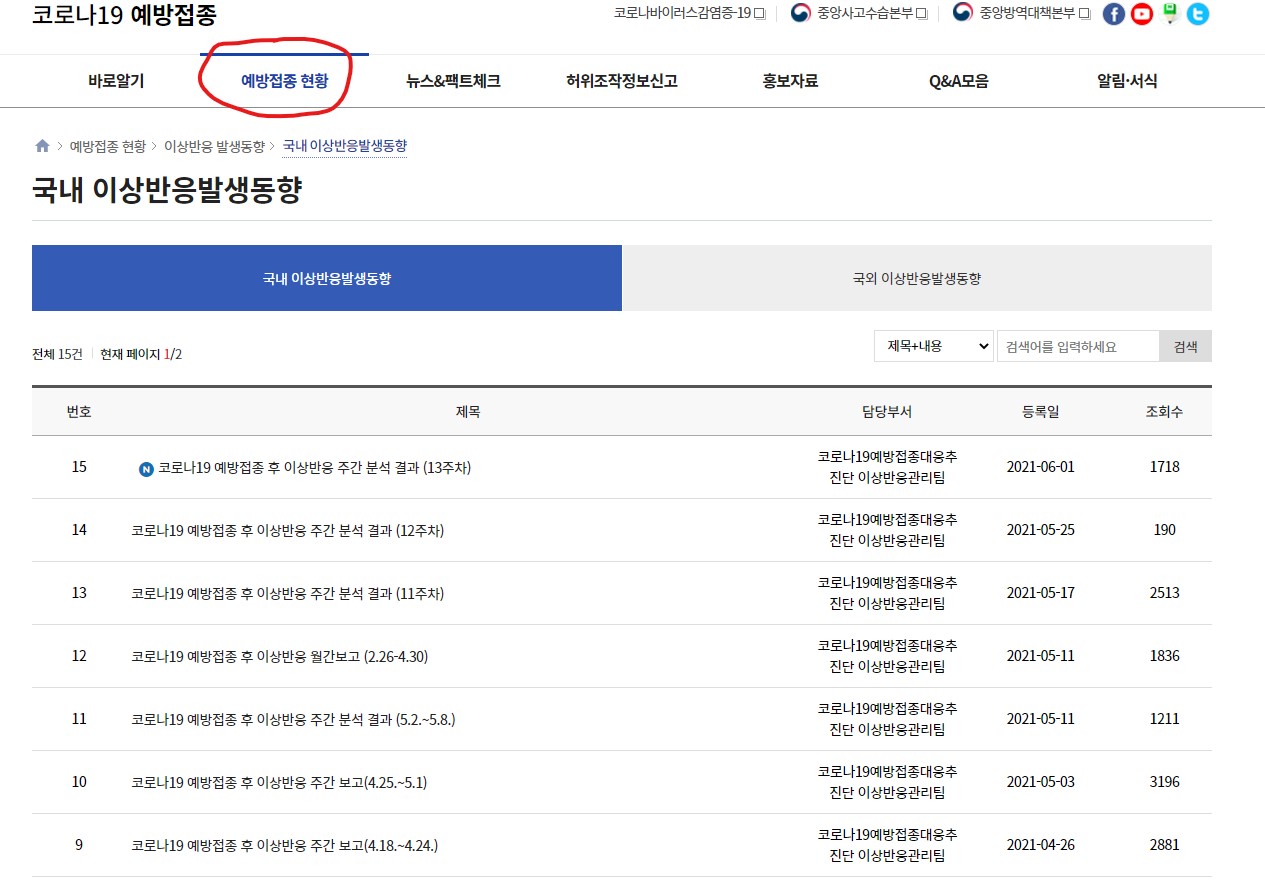 코로나19 예방접종 사전예약 시스템에서는 코로나 백신에 관해서 이상반응이 일어난걸 이렇게 확인할 수 있습니다. 국내와 국외 둘다 가능하구요. 언론에서 누가 얼마 죽었다 누가 위독하다 이런걸 안보더라도 알 수 있습니다.