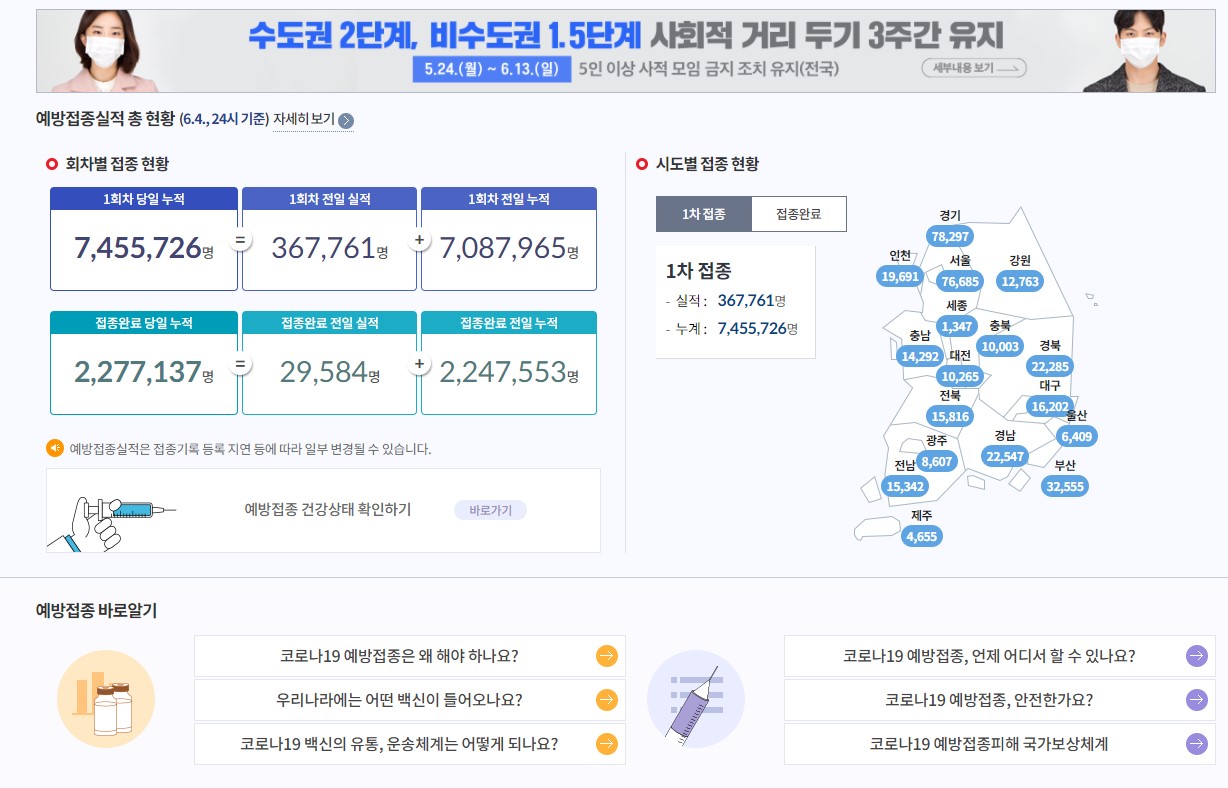 지금 코로나19에 전부 질려서 빨리 예방접종을 하자라는 분위기 같습니다. 몇일 기준으로 얼마나 접종을 했는지 확인이 가능한데요. 지금 사진은 6월 4일 기준입니다. 6월 4일 기준으로 각 지역별로 확인이 가능한데요. 서울과 경기도는 거이 8만명씩 맞았네요. 저희가 사는 경북은 2만2천명으로 아직 예방접종을 맞이 맞진 않았네요.
