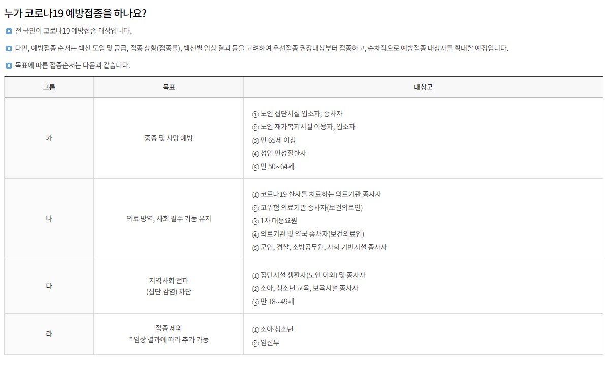 코로나19 백신 예방접종은 전 국민이 순서입니다. 가나다라로 나뉘어 지게 되는데 가부터 시작하면 된다고 생각하면 됩니다. 가는 중증 및 사망 예방으로 노인 집단시설 입소자, 종사자 대상으로 나이가 많으신분들이 먼저 맞으시고 그 다음은 의료 방력, 사회 필수 기능 유지로 의료기관 종사가나 군인, 경찰 등 사회에 필수적인 일을 하시는분들이 맞게 됩니다. 그다음은 집단시설에서 생활하는 종사자나 입소자가 맞게 되구요. 일단 소아, 청소년, 입산부는 접종이 제외가 되었네요. 후에 임상에 따라 접종을 할 수 있다고 합니다.