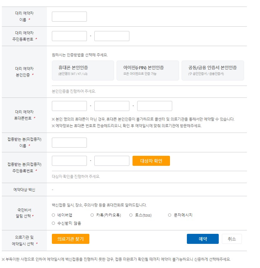 코로나19 예방접종 사전예약시스템에서 본인 예약 및 대리 예약에 들어가시면 요렇게 개인정보를 입력하는 곳이 나옵니다. 간단하게 이름, 주민등록번호를 입력한 후 본인인증을 하시고(휴대폰, 아이핀, 공동인증서) 휴대폰 번호를 입력하시면 됩니다. 의료기간은 본인인증을 확인 후 찾기가 가능하다고 합니다. 이렇게 코로나19 예방접종 사전예약시스템을 활용하시면 간단하게 코로나19 백신 예방접종을 할 수 있습니다.