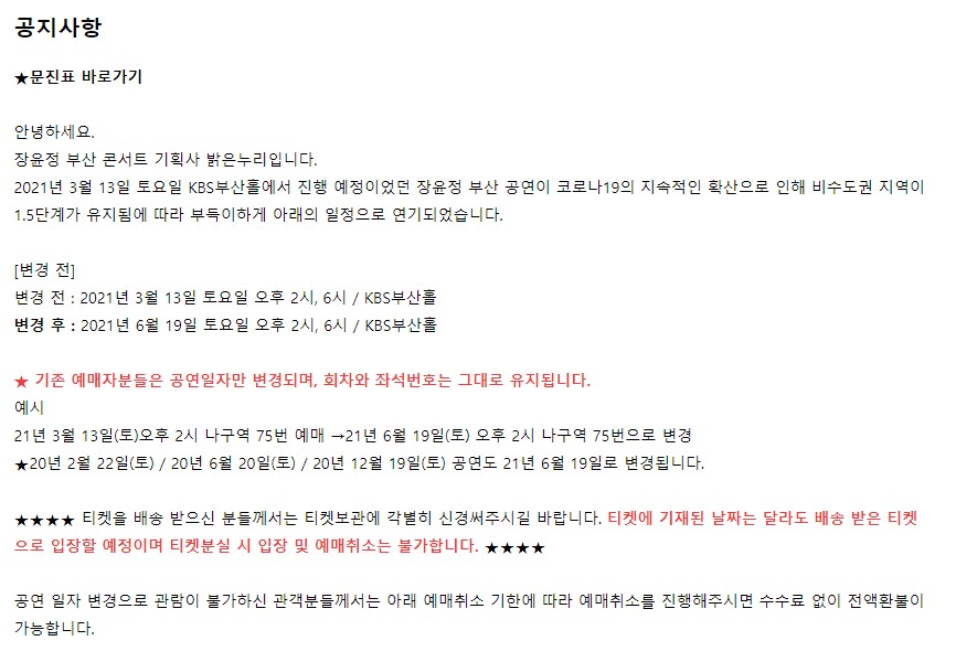 콘서트 예매 취소에 관한 내용이다. 예매의 환불을 원하는분들은 3월 31일 수요일 오후 5시까지 취소했을때 환불이 되었다고 한다. 기간이 지나니.. 환불은 어려울 것 같다. 혹시나 공연연기가 있을 경우 개별연락으로 안내할것이며 분실시에는 취소가 불가능하다고 한다.