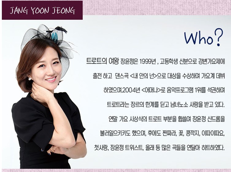 장윤정은 1980년 출생으로 충북 충주에서 2월 16일에 태어났다 ! 데뷔는 1999년 고등학생 신분으로 강변가요제에 출전하여 댄스곡인 내 안의 넌으로 대상을 수상하였다! 그리고 모두가 잘 아는 히트곡 어머나로 2004년 음악프로그램 1위를 휩쓸고 다니며 트로트의 장르를 부수고 모든 연령의 사랑을 받았다. 이 후 짠짜라, 꽃, 콩깍지, 이따이따요, 등등 많은곡을 히트시킨 트로트계의 퀸이다.