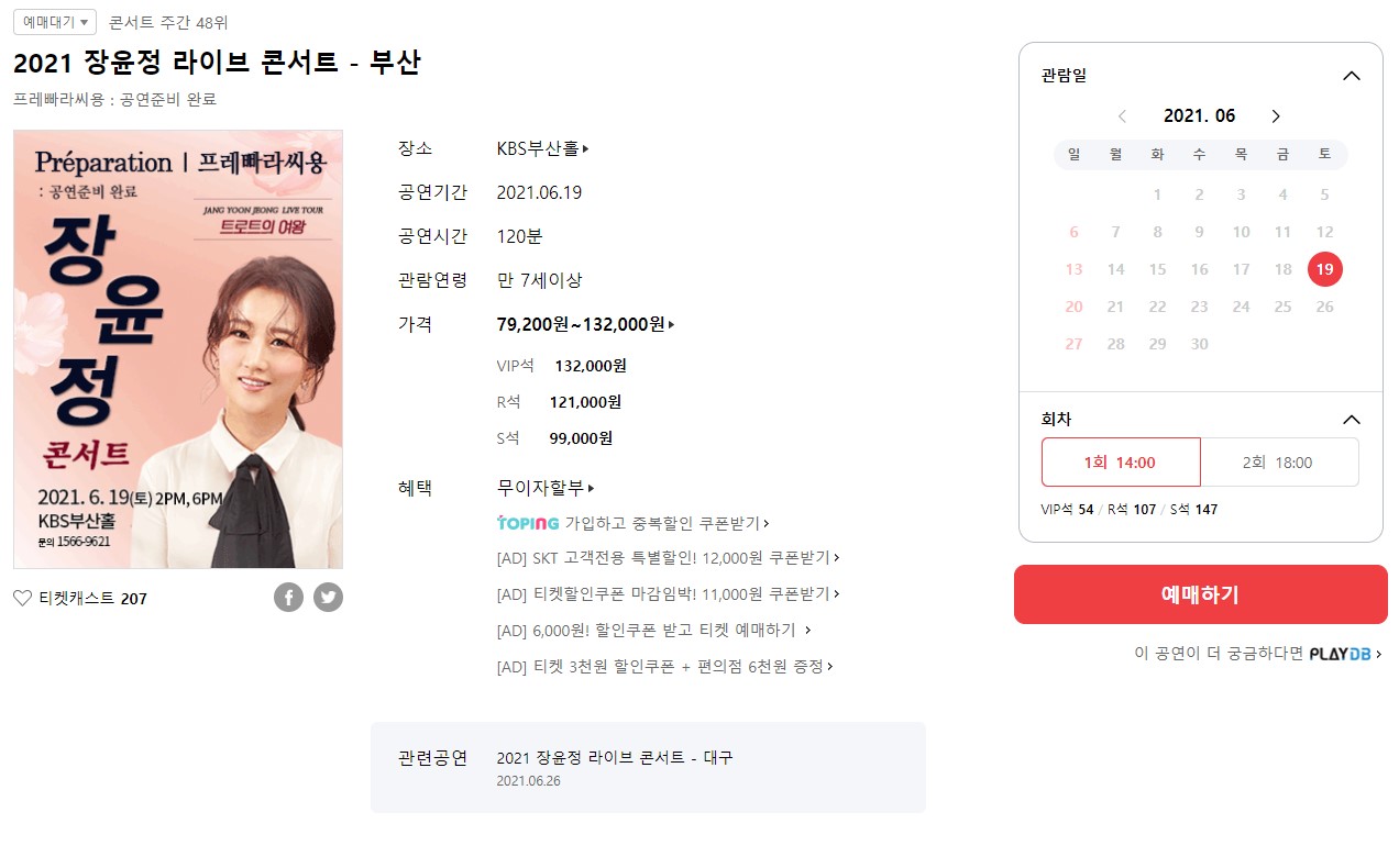 장윤정 콘서트에 가격표이다. vip석이 132,000원, r석이 121,000원, s석이 99,000원이다. 지금 17일 11시 30분 기준으로 2시 기준 좌석이 vip석이 54석, r석이 107석, s석이 147석이 남아있다. 꽤 많은 좌석수가 남아 있는데 코로나로 인한 여파가 아닐까 싶다. 이후에 또 6시에 공연이 잡혀있다.
