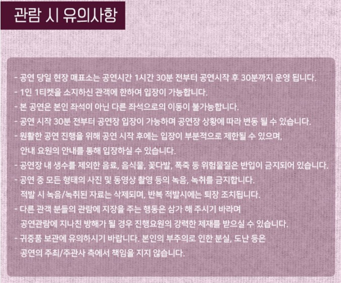 그리고 지금은 코로나 상황으로 전 관객 흰색 마스크 착용의무라고 한다. 그리고 전 관객대상으로 자가 문진표 작성 및 개인정보 활용동의서를 진행할 내용이라고 하니 꼭 작성하길 바란다. 그리고 전 관객 대상으로 체온측정이 있으니 꼭 체온측정일 하시길 바란다.