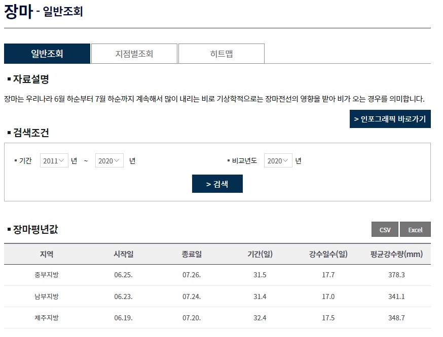 이렇게 싸이트에 접속하셔서 장마를 클릭하시면 장마의 평년값은 물론 장마에 관련된 지역별 강수량 계급일수, 전국 강수량 및 강수일수 , 지역별 평균 강수량 강수일수 기타 등등 여러가지 많이 확인할 수 있으니 확인해보시는게 좋을 것 같아요.