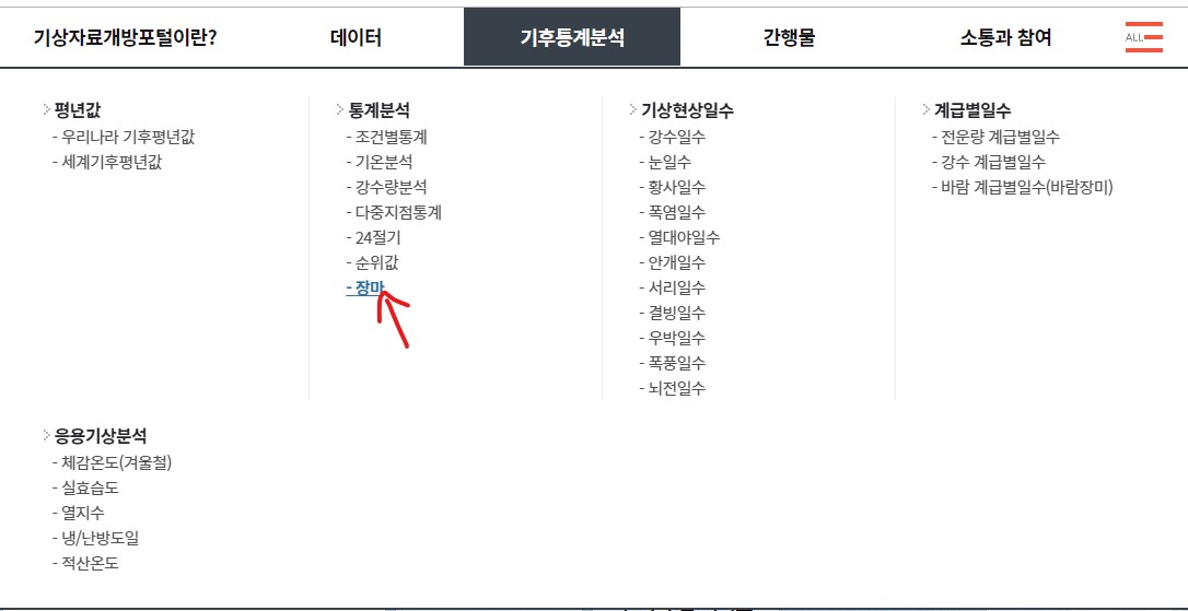 이렇게 싸이트에 접속하셔서 장마를 클릭하시면 장마의 평년값은 물론 장마에 관련된 지역별 강수량 계급일수, 전국 강수량 및 강수일수 , 지역별 평균 강수량 강수일수 기타 등등 여러가지 많이 확인할 수 있으니 확인해보시는게 좋을 것 같아요.