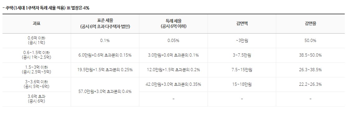 주택 : 0.1%~0.4% (4단계 누진세율) , *1세대 2주택자 특례세율 적용 , * 별장 : 4%