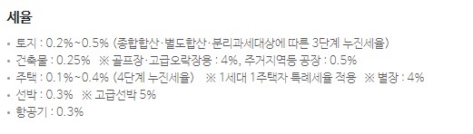 토지 : 0.2%~0.5% (종합합산, 별도합산, 분리과세대상에 따른 3단계 누진세율)