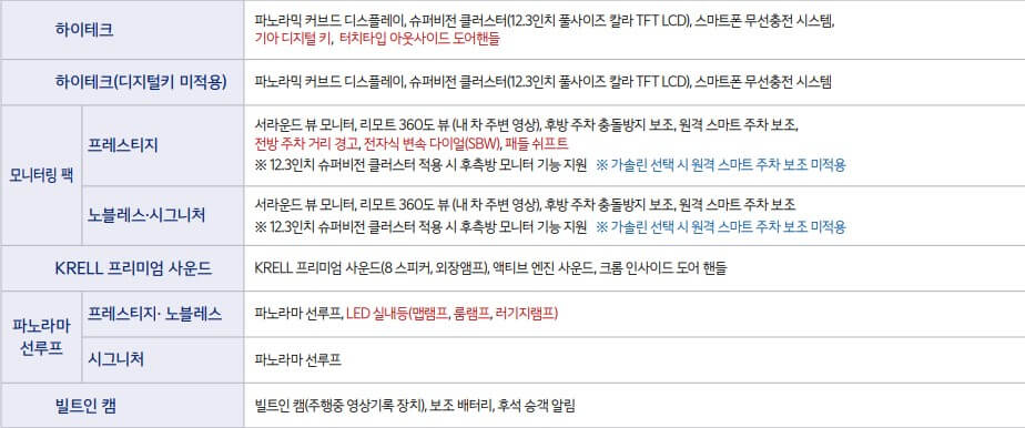 - 편의 : 스마트폰 무선충전 시스템, 기아 디지털 키, 운전석 메모리시트, 운전석 이즈 억세스, 동승석/2열 세이프티 파워 윈도우