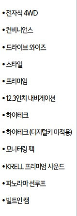 - 편의 전자식 변속 다이얼, 패들 쉬프트, 후방 모니터, 레인센서, 스마트 파워테일게이트, 독립제어 풀오토 에어컨, 공기청정 시스템, 1열 시트백 C타입 USB 단자, 러기지 파워아웃렛
