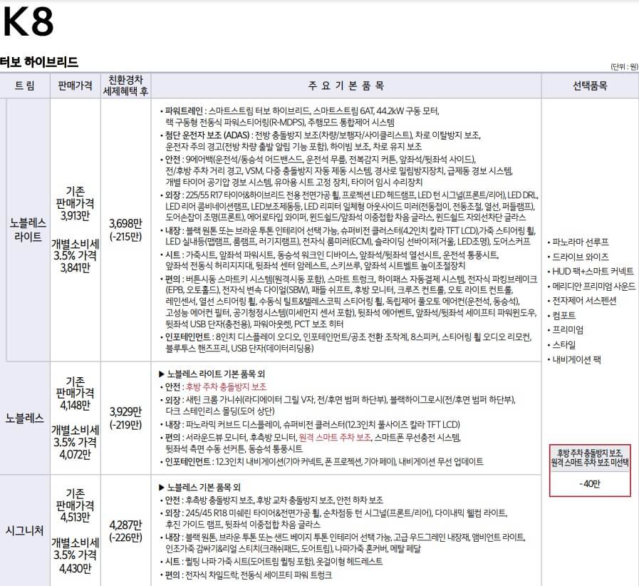 k8 하이브리드 노블레스 라이트입니다. 판매가격은 3913만원. 개별소비세 3.5% 할인 적용시 3841만원. 친환경차 세제 혜택 후 3698만원입니다.