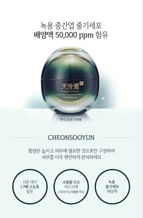 크림밤과 마찬가지로 녹용 중간엽 줄기세포배양액에 소나무 잎 추출물을 더해서 메마른 피부 균형을 이상적으로 맞추고 촉촉한 피부 바탕으로 만들어주는 프리미엄 세럼 에센스라고 합니다.
