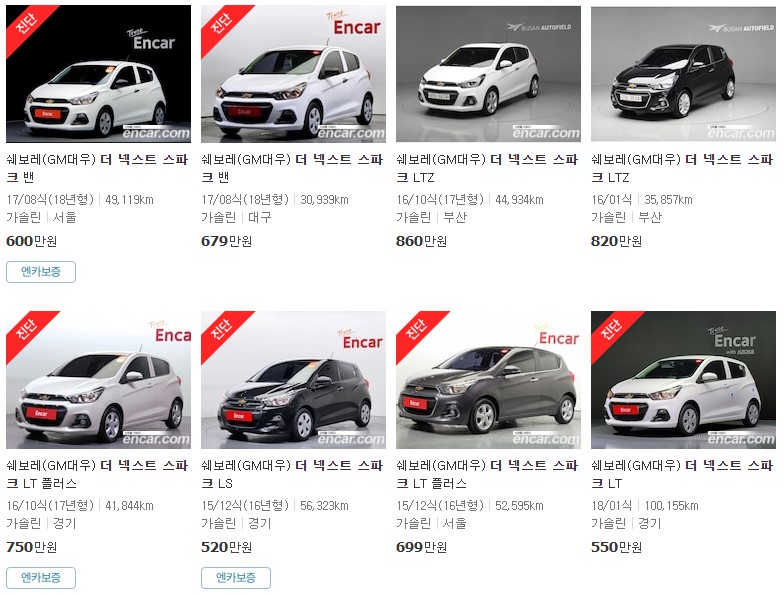 더 뉴 스파크입니다. 연식으로는 18년에서 현제까지 입니다. 대부분 가솔린모델입니다. 가격대의 형성을보면 정말 싼 가격은 600만원 중반 비싼가격은 1000만원에 매물이 올라와 있습니다. 역시 감가가 적은 경차모델입니다. 이 가격표는 sk엔카에 가시면 더 정확히 매물의 상태를 보실 수 있습니다.